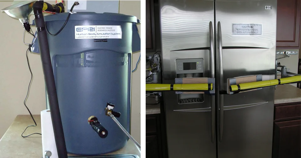 The TVA didn't stop there. To mimic human activity in each house, every appliance or utility was used at a regular schedule over the course of the experiment. Refrigerator doors opened and closed at preset times (see image right). The TVs turned on to no one watching. The showers sprayed empty tubs. Going one step further, the TVA included "Human Body Emulation Systems" (see image left) which generated ambient heat and humidity similar to what an average human family would output. Containers of water filled the fridges to simulate the humidity and thermal properties of food.
